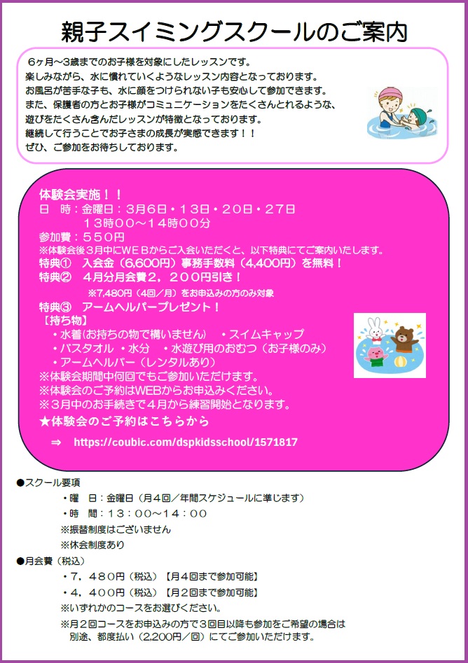 4月より親子スイミングがリニューアル!それに伴い、3月は体験会を実施します!