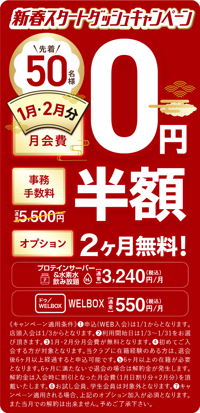 ●新規入会キャンペーンとの併用が可能です。その他特典との併用につきましては店舗にお問い合わせください。