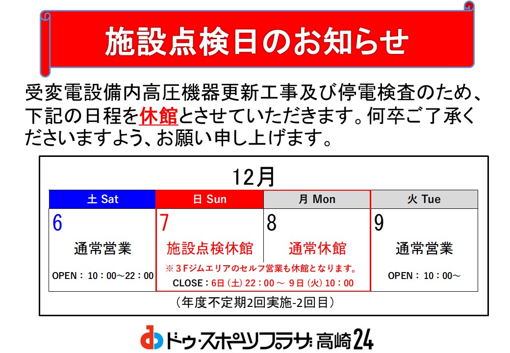この度、施設点検実施のに伴い、下記の日程を休館とさせていただくこととなりました。