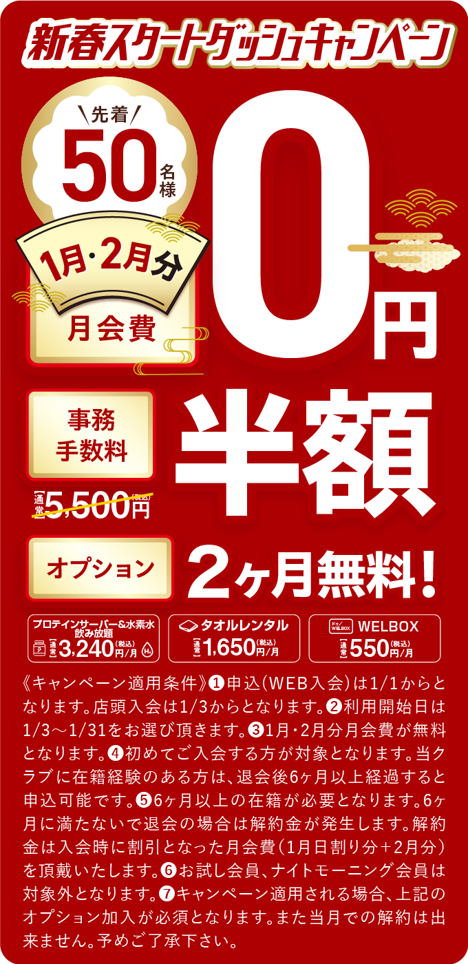 ●新規入会キャンペーンとの併用が可能です。その他特典との併用につきましては店舗にお問い合わせください。