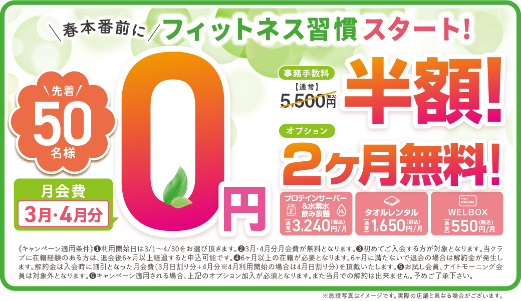 ① 初めてご入会する方が対象となります。当クラブに在籍経験のある方は、退会後6ヶ月以上経過すると申込可能です。(既存会員からの変更は出来ません) ② 初月会費は日割り計算となります。 ③ 6ヶ月以上の在籍が必要となります。6ヶ月に満たないで退会の場合は解約金が発生します。解約金は11,000円となります。 ④ お試し会員期間が終了すると3ヶ月目より自動で「レギュラー会員」への登録となります。それ以外の会員種別をご希望の場合は、期間中に変更手続きをお願いします。(切り替え手数料1,100円が必要。尚、Webからは無料。) ⑤ 別途、事務手数料5,500円のお支払いが必要となります。 ⑥ 次のオプションへの加入が必要となります。(当月解約不可)「プロテインサーバー&水素水飲み放題2ヶ月無料」「ドゥ・WELBOX2ヶ月無料」 ※ 価格はすべて税込表記です。 ※ キャンペーン内容により金額・条件が変わる場合がございます。 ※ セルフタイム営業時間の利用には別途オプションの登録(有料)が必要となります。